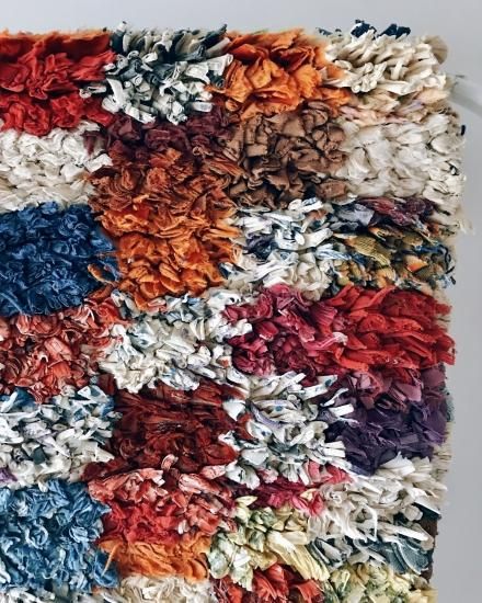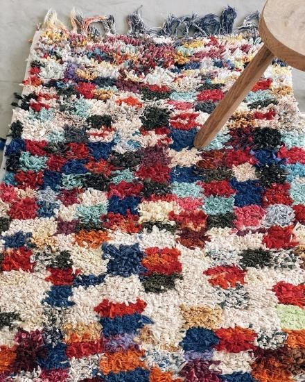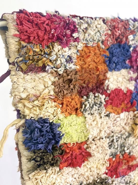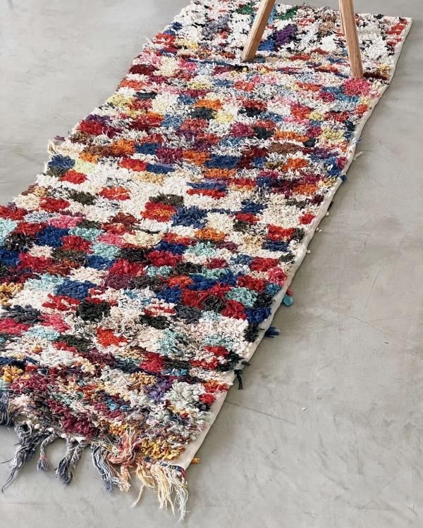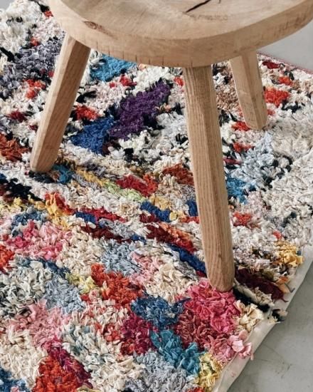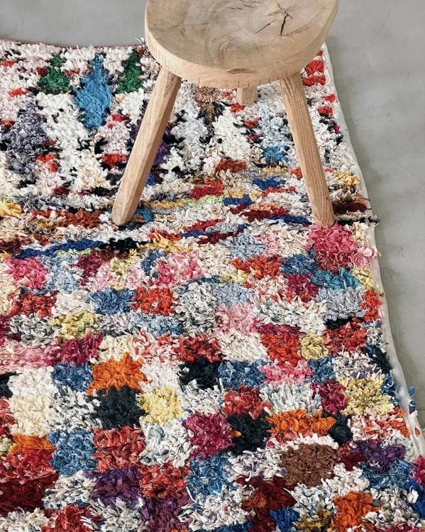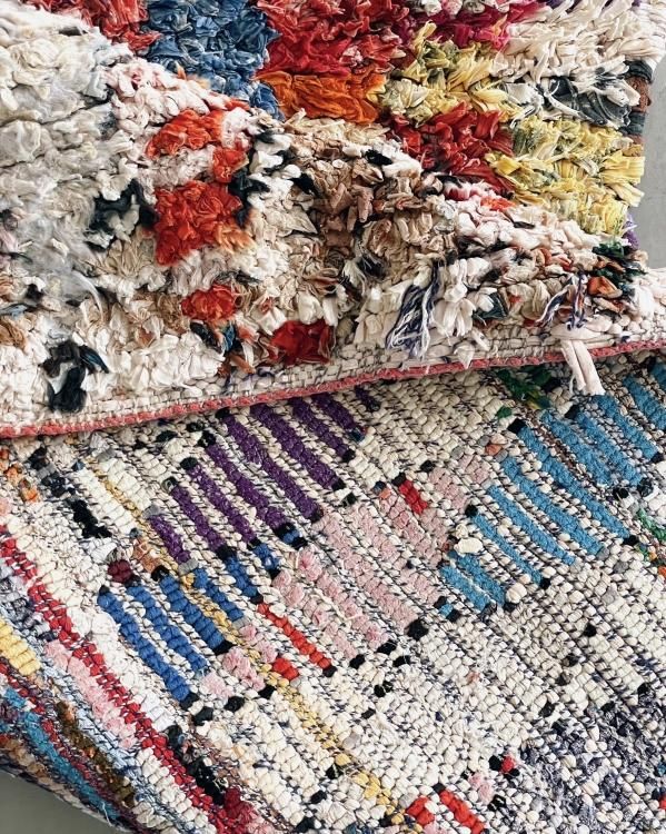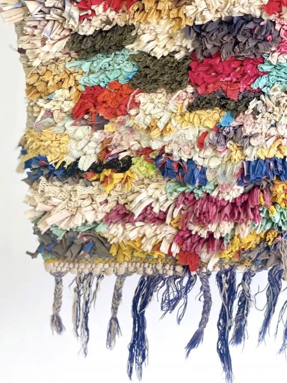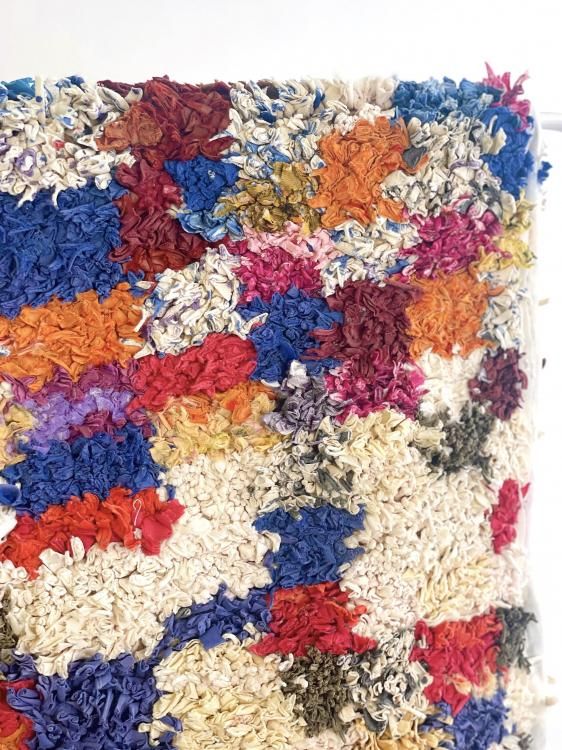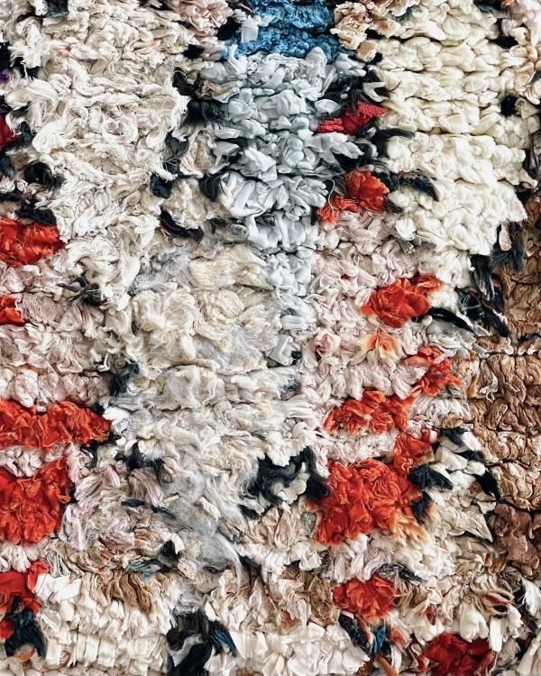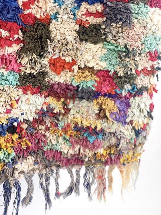 縦糸には、太く縒ったコットンを使い、裂き布の横糸を通し、毛足になる布を結びつけていきます。織り機自体も、適当な棒を使って組み立てることが多いので、サイズは適当。ウールを使ったラグの場合、ベルベル人の伝統的な柄が織り込まれることが多いのですが、ボ・シャラウィットは、即興的に自由にデザインされたものがほとんどです。
